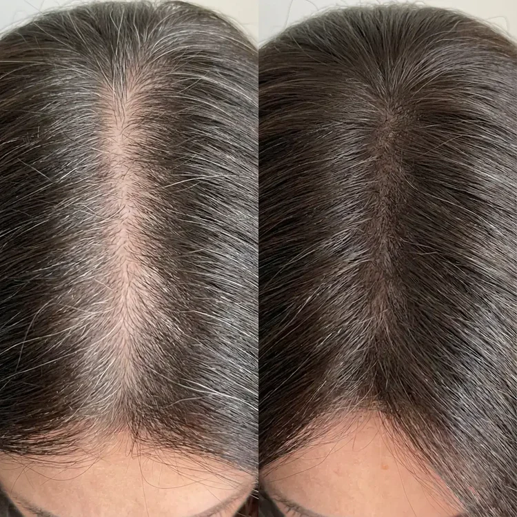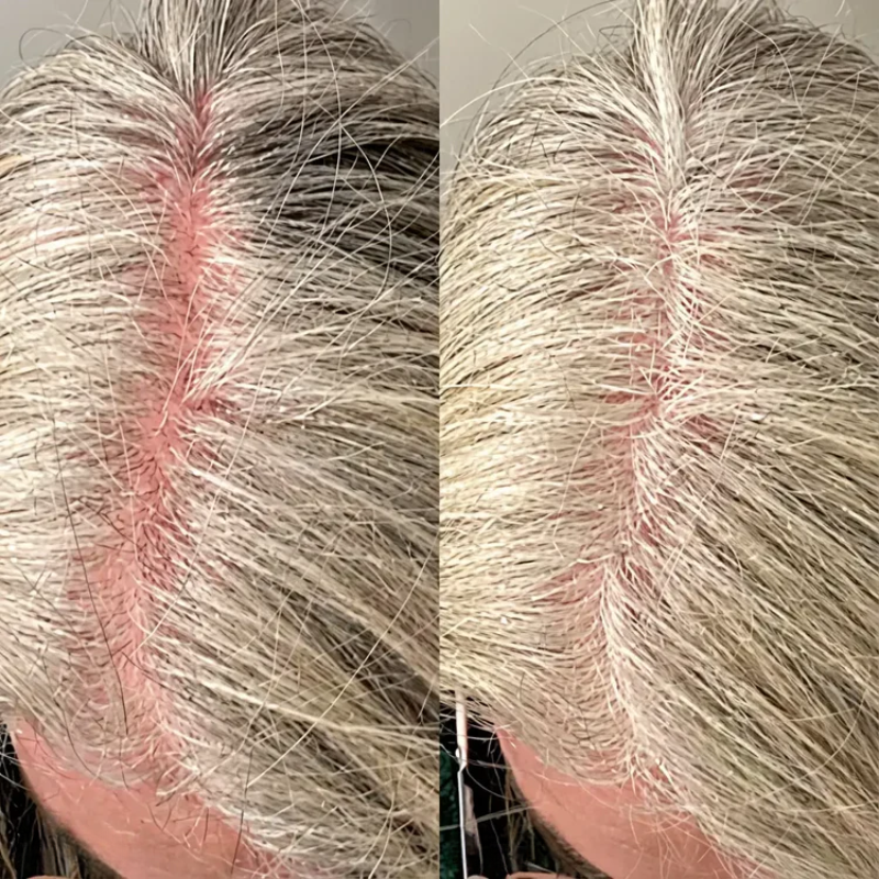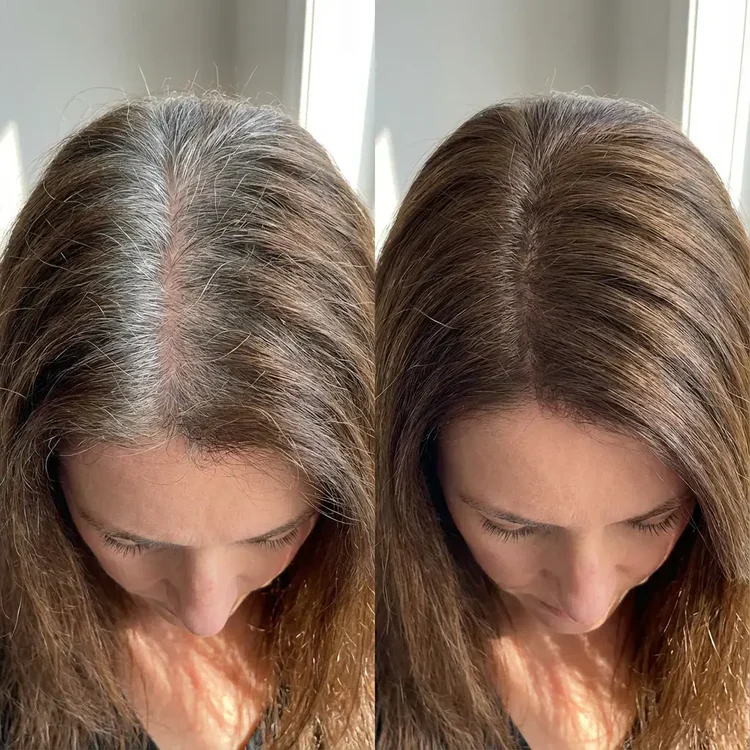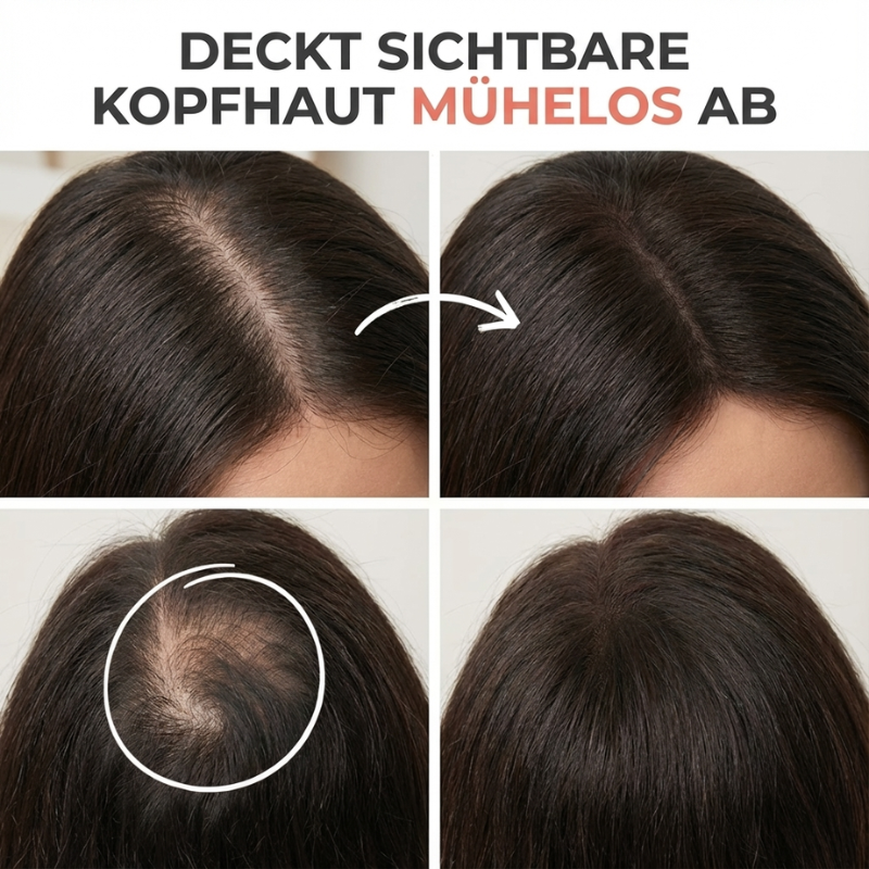 Es mildert den Kontrast zwischen Ihrem Haar und Ihrer Kopfhaut, sodass dünnere Stellen natürlich voller wirken und Ihr Scheitel nicht mehr quer durch den Raum Aufmerksamkeit auf sich zieht.